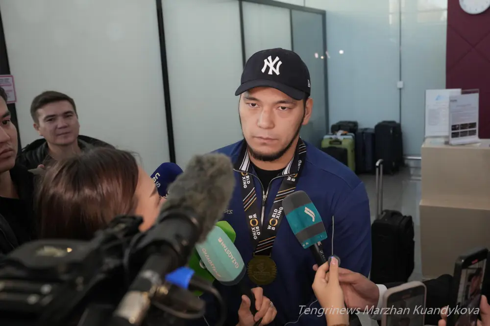 Золотые призеры чемпионата мира по боксу, Санжар Ташкенбай и Айбек Оралбай, вернулись в Казахстан после успешного выступления в Ливерпуле, Англия.