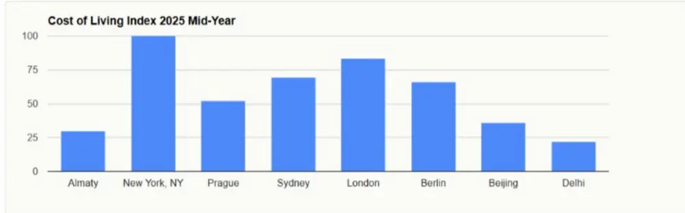 Индекс стоимости жизни в Алматы составляет 29,4 пункта, что позволяет ему занять 346-е место в мировом рейтинге. Астана находится на 366-м месте с индексом 26,5. Для сравнения, Бишкек занимает 364-е место (индекс 26,8), а Ташкент — 370-е место с индексом 26,2. Города Таджикистана и Туркменистана в этом рейтинге отсутствуют.