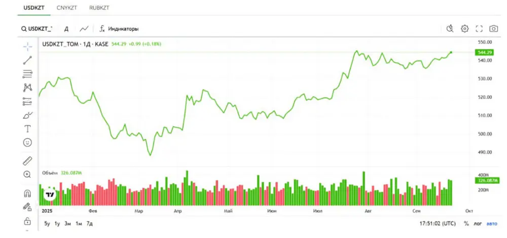 По итогам торгов на Казахстанской фондовой бирже (KASE) к 17:00 по времени Астаны средневзвешенный курс доллара составил 544,91 тенге, что на 1,98 тенге больше, чем днем ранее.