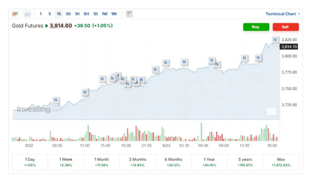 Цена фьючерсов на золото увеличилась на 1,05% и составила 3 814,60 доллара за унцию.