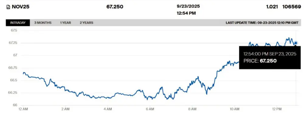 Цена ноябрьских фьючерсов на нефть марки Brent выросла на 1,02% и составила 67,25 доллара за баррель.