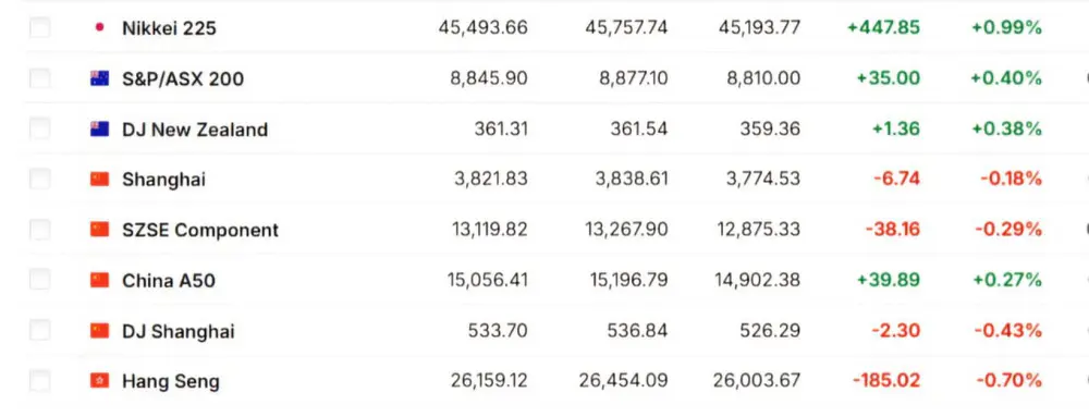 Азиатские рынки закрылись разнонаправленно. Индексы Shanghai Composite (-0,18%) и Hang Seng (-0,70%) показали снижение, в то время как японский индекс Nikkei 225 увеличился на 0,99%.