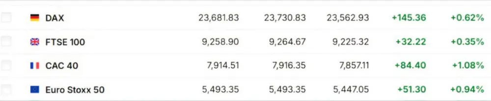 Основные индексы, такие как DAX (+0,62%, Германия), CAC 40 (+1,08%, Франция), Euro Stoxx 50 (+0,94%, включает 50 крупнейших компаний еврозоны) и FTSE 100 (+0,35%, Великобритания), продемонстрировали рост.