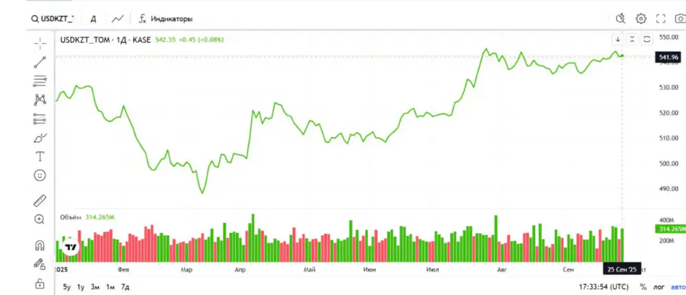 На Казахстанской фондовой бирже (KASE) средневзвешенный курс доллара на 17:00 по времени Астаны составил 541,81 тенге, что на 0,79 тенге меньше, чем в предыдущий торговый день. Официальный курс Национального банка на этот день равен 542,8 тенге за доллар.