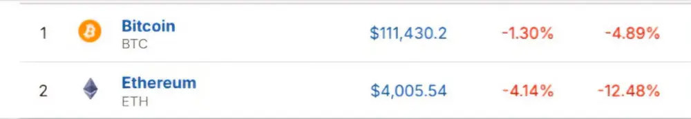 Курс Bitcoin (BTC) снизился на 1,30%, а Ethereum (ETH) упал на 4,14%, достигнув 4 005,54 доллара за монету. Основные причины падения - активные продажи криптовалюты крупными инвесторами, что приводит к сокращению притока средств, и макроэкономическая неопределенность, связанная с осторожной позицией ФРС.