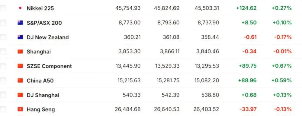 Азиатские фондовые рынки закрылись с разной динамикой. Индекс Shanghai Composite в Китае снизился на 0,01%, а Hang Seng - на 0,13%, что связано с обсуждениями регуляторов о мерах по охлаждению фондового рынка. В то же время японский индекс Nikkei 225 вырос на 0,27% благодаря позитивным корпоративным отчетам.