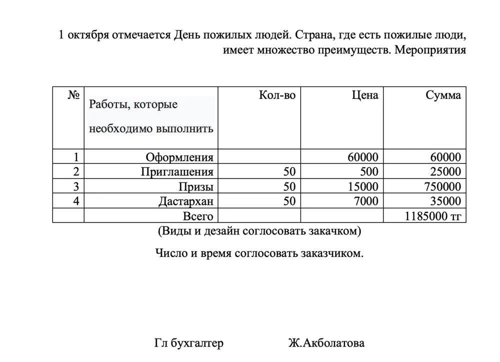 Планируется потратить 1 185 000 тенге на украшение населённого пункта к празднику в селе Каратобе. Несмотря на неуместное название, в документации отмечается, что 1 октября – это День пожилых людей, и подчеркивается важность пожилого поколения для общества.