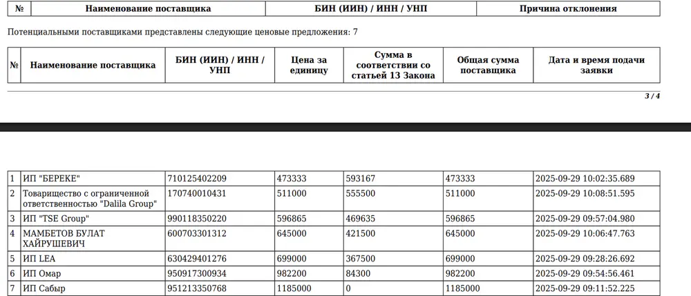 Организацию праздника доверили индивидуальному предпринимателю "Береке". В тендере участвовали семь компаний, которые предложили свои услуги по более низким ценам, от 470 до 980 тысяч тенге. Ниже представлена разбивка поданных заявок.