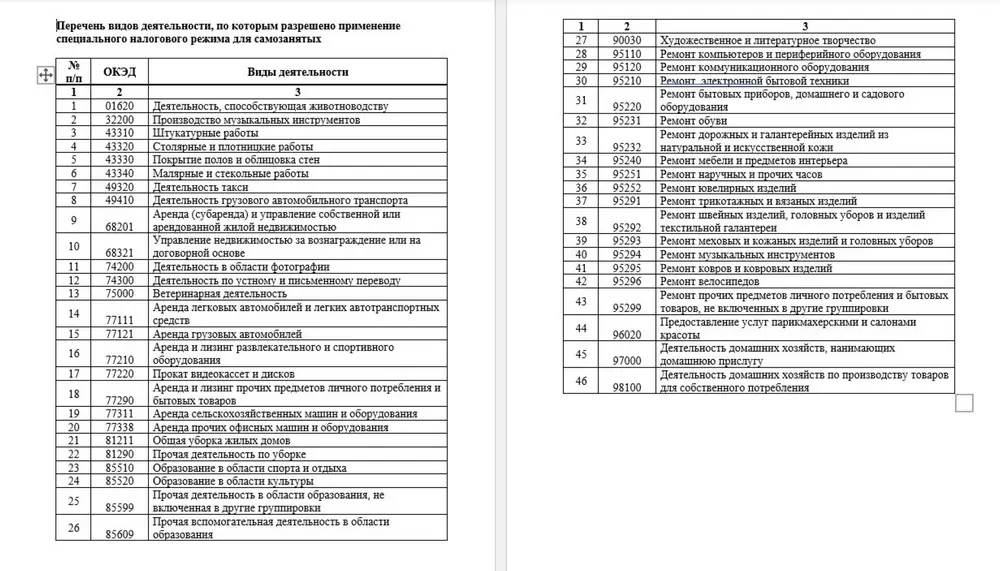 Недавно Министерство нацэкономики Казахстана опубликовало проекты постановления правительства, которые содержат списки видов деятельности, которые не смогут работать по упрощённой системе налогообложения с 2026 года, а также перечень видов деятельности, для которых разрешено применение специального налогового режима для самозанятых. В него вошли 46 видов деятельности.