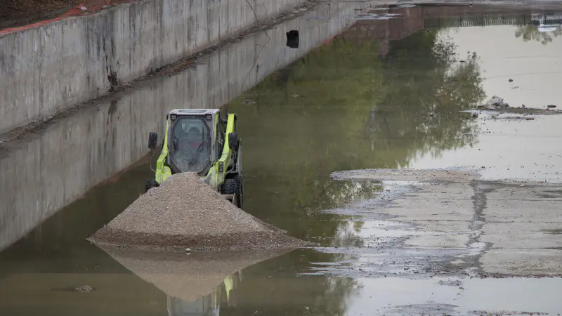Рабочие пытаются откачать скопившуюся воду с помощью насосов, однако некоторые участки затоплены значительно сильнее других.