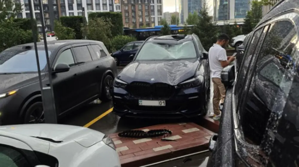 В Астане во время урагана на автомобиль упала большая плита. По словам очевидцев, инцидент произошёл на парковке перед БЦ Sat Tower и Fitness Palace. К счастью, пострадавших нет.