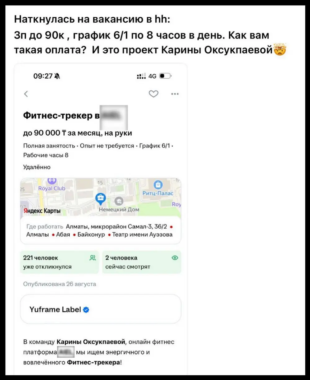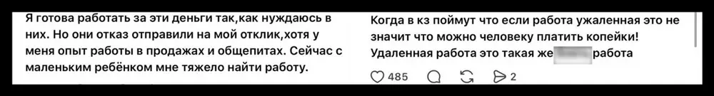 "Наткнулась на вакансию: зарплата - до 90 тысяч тенге, график 6/1 по 8 часов в день. Как вам такая оплата? Это проект Карины", - выразила недовольство пользовательница.