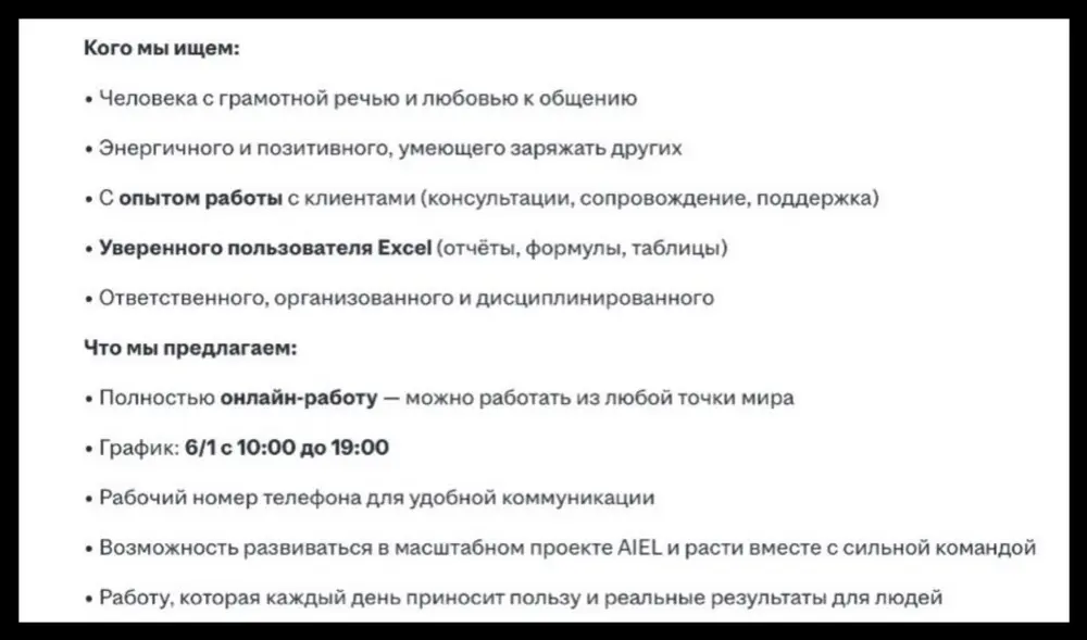 "Мы предоставляем честный фикс без KPI, штрафов и скрытых условий. Это стабильный доход в прозрачных условиях. Многие начинают с этой позиции и через год могут занять руководящие должности. Мы понимаем, что это не для всех, но такие форматы дают возможность большему количеству людей строить карьеру в удобном для себя ритме", - заявили в компании.