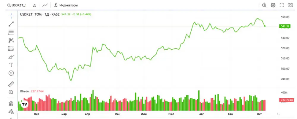 На Казахстанской фондовой бирже (KASE) по итогам торгов на 17:00 по времени Астаны средневзвешенный курс доллара составил 541,45 тенге, что на 3,81 тенге ниже предыдущего значения. Официальный курс Национального банка на 7 октября составляет 545,67 тенге за доллар.