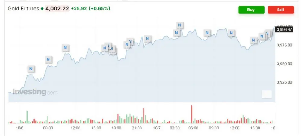 Золото достигло рекордного максимума, превысив отметку 4 000 долларов за унцию. Это связано с продолжающейся политической и экономической нестабильностью, включая шатдаун правительства США. Фьючерсы на золото подорожали на 0,65% и составили 4 002,22 доллара за унцию.