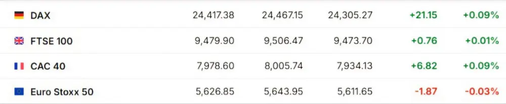 Европейские фондовые рынки показали небольшое улучшение, в то время как американские рынки открылись в минусе. Индексы FTSE 100 (+0,01%), CAC 40 (+0,09%) и DAX (+0,09%) продемонстрировали положительную динамику. В то же время Euro Stoxx 50 снизился на 0,03%.