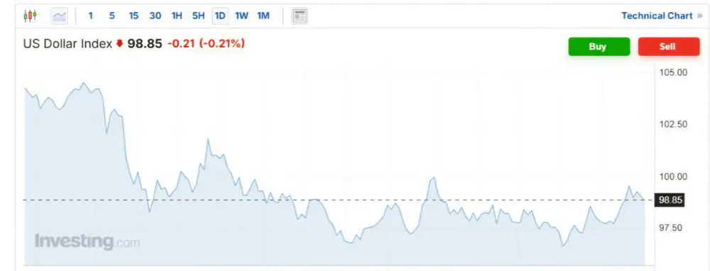 Индекс доллара США (U.S. Dollar Index, DXY), который отражает курс доллара по отношению к основным мировым валютам, снизился на 0,21% после выступления председателя ФРС Джерома Пауэлла. Он указал на возможность дальнейшего снижения ставок в условиях сохраняющейся слабости на рынке труда в США.