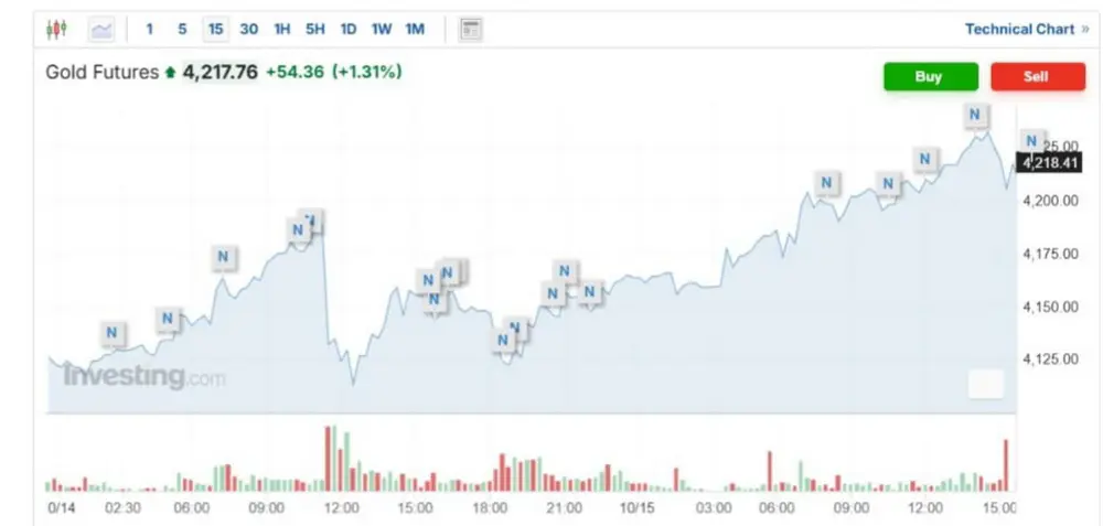 Фьючерсы на золото поднялись на 1,31%, достигнув 4 217,76 доллара за унцию.