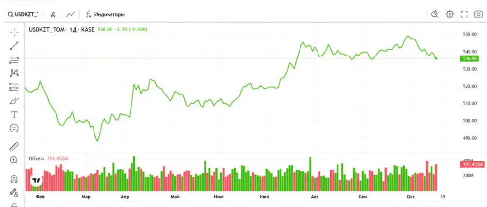 По итогам торгов на Казахстанской фондовой бирже (KASE) на 15:30 по времени Астаны средневзвешенный курс доллара составил 536,32 тенге, что на 1,32 тенге ниже предыдущего значения.