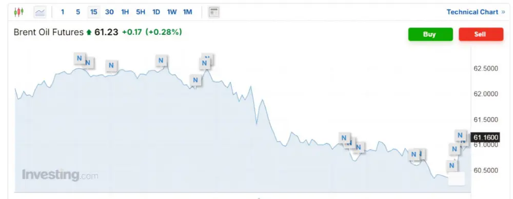 Цена декабрьских фьючерсов на нефть марки Brent увеличилась на 0,28% и составила 61,23 доллара за баррель.