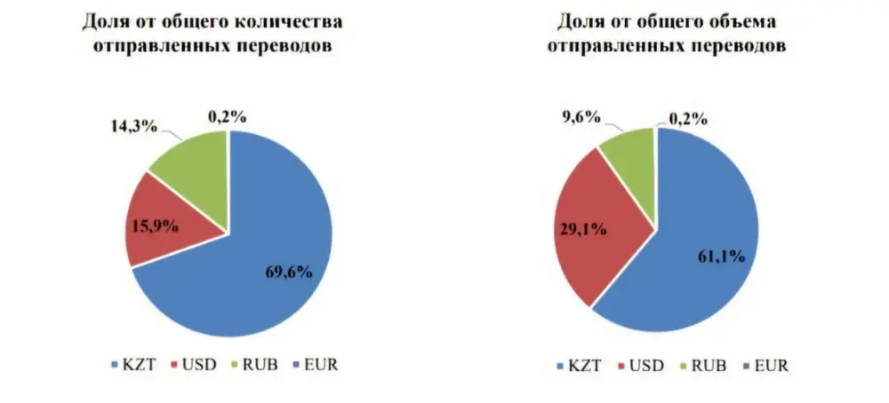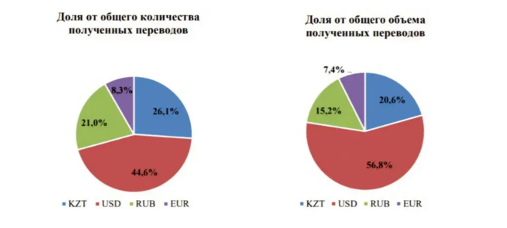 Анализ валюты переводов показывает, что большая часть сумм, отправленных из Казахстана за границу, осуществлялась в казахстанских тенге, составив 61,1% от общего объема. Напротив, в Казахстан деньги чаще всего поступали в долларах, доля которых составила 56,8% от суммы.