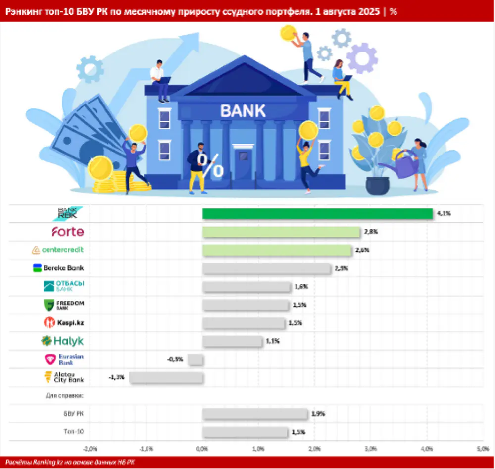 Лидером по росту ссудного портфеля среди крупных банков стал Bank RBK, который увеличил свои кредиты на 4,1 процента, доведя общий объем до 1,3 триллиона тенге. С начала года банк нарастил портфель займов на 13,5 процента. Bank RBK активно предоставляет кредиты как населению, так и бизнесу, включая малый и средний бизнес, предлагая доступное финансирование и участвуя в государственных программах поддержки предпринимателей совместно с фондом "Даму". В рамках новой программы "Өрлеу" предприниматели могут получить льготное финансирование на срок до 10 лет, а также гарантии от фонда "Даму" в размере до 85 процентов от суммы займа, который может достигать 3,5 миллиарда тенге.