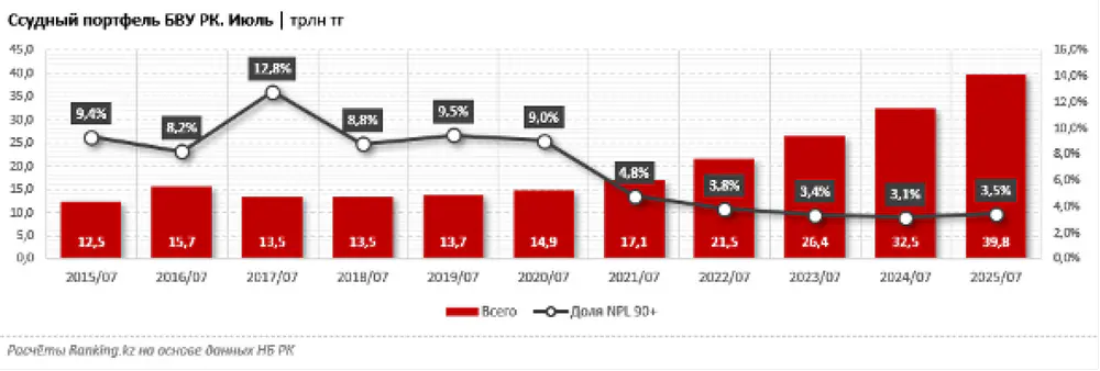 В отчете Ranking.kz отмечается, что за последний год ссудный портфель банков Казахстана увеличился на 22,7 процента, за пять лет — в 2,7 раза, а за десятилетие — в 3,2 раза. Доля просроченной задолженности (NPL 90+) по состоянию на август 2023 года в среднем по сектору составила всего 3,5 процента.
