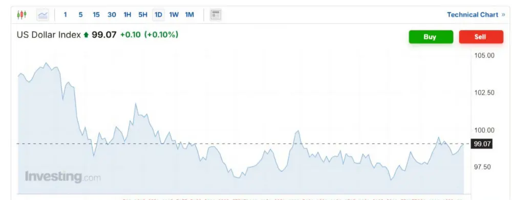 Индекс доллара США (U.S. Dollar Index, DXY) вырос на 0,10 процента. Это связано с тем, что часть инвесторов вновь обращается к американской валюте как к безопасному активу. Также слабые данные по инфляции в Великобритании негативно сказались на курсе фунта, что способствовало относительному укреплению доллара.