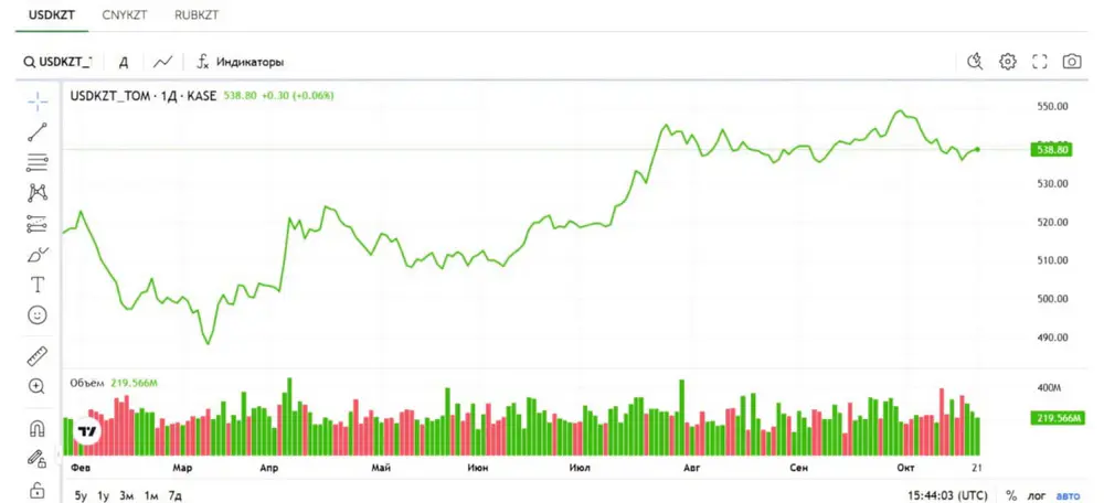 На Казахстанской фондовой бирже (KASE) по состоянию на 15:30 по времени Астаны средневзвешенный курс доллара составил 538,53 тенге, что на 0,08 тенге ниже предыдущего значения. Официальный курс Национального банка на сегодняшний день составляет 538,56 тенге за доллар.