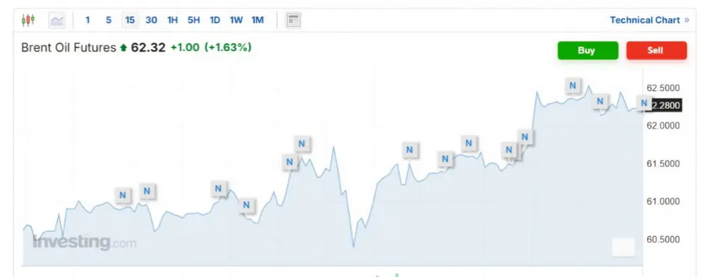 Нефть продолжает расти в цене на фоне оптимизма по поводу возможного торгового соглашения между США и Индией, а также из-за снижения запасов «чёрного золота» в США и намерений Вашингтона пополнить истощённые нефтяные резервы. Цена декабрьских фьючерсов на нефть марки Brent увеличилась на 1,63 процента, достигнув 62,32 доллара за баррель. Ноябрьские фьючерсы на нефть марки WTI поднялись на 1,99 процента, составив 58,38 доллара за баррель.