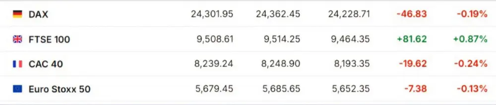 Европейские рынки продемонстрировали разнонаправленную динамику. Большинство индексов, таких как DAX и CAC 40, снизились под давлением слабых корпоративных отчётов и возросшей геополитической неопределённости. В то же время индекс FTSE 100 вырос на 0,87 процента благодаря более мягким, чем ожидалось, данным по инфляции в Великобритании, что снизило риск незапланированного повышения ставок.