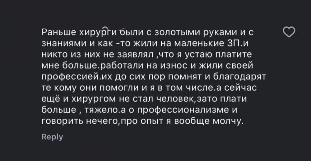 Ладно бы это писали только люди, которые далеки от медицины. Больше всего меня поразили врачи, которые стали оставлять комментарии из серии: "Когда мы были резидентами, работали бесплатно и не жаловались. Ну что за молодежь пошла?!" Посмотрела профили некоторых: чуть старше или мои ровесники. Молодые врачи. Но даже они не поняли, что в интервью я хотела сказать вовсе не про деньги. А про то, в какой… хм… яме находится наша медицина.
