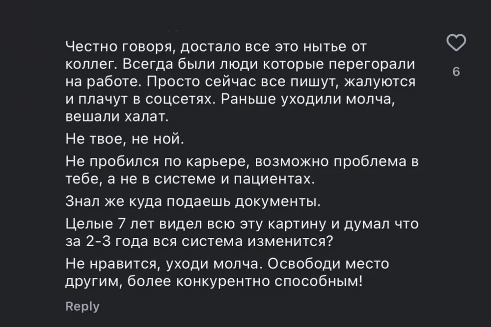 Этого (чего ещё я, наивная, хотела) не скажешь о комментариях под публикацией. Думаете, мы их не читаем? Конечно, читаем. И еще больше убеждаемся, что, видимо, всё-таки нужно уходить из медицины.