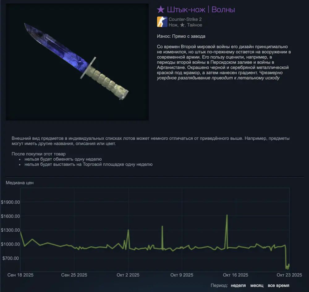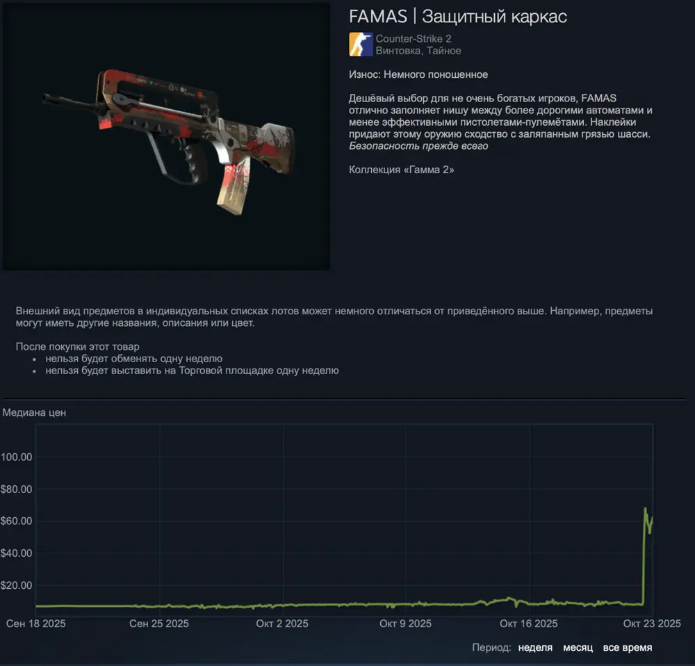23 октября 2025 года обновление игры от компании Valve вызвало настоящий шок: стоимость всех скинов упала с 6 миллиардов до примерно 4 миллиардов долларов, что стало серьёзным ударом для игроков и трейдеров, которые зарабатывали на покупке и продаже этих предметов.