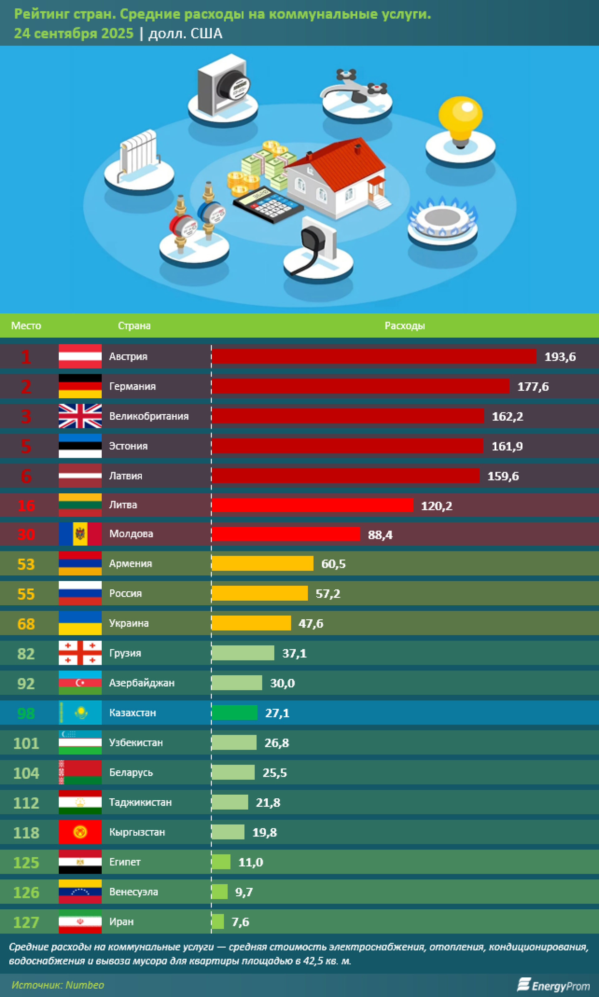 По состоянию на 24 сентября 2025 года, средние месячные расходы на жилищно-коммунальные услуги в Казахстане составили всего 27,1 доллара (приблизительно 15 тысяч тенге). Это позволило стране занять 98-е место в мировом рейтинге по дороговизне коммунальных услуг среди 127 стран.