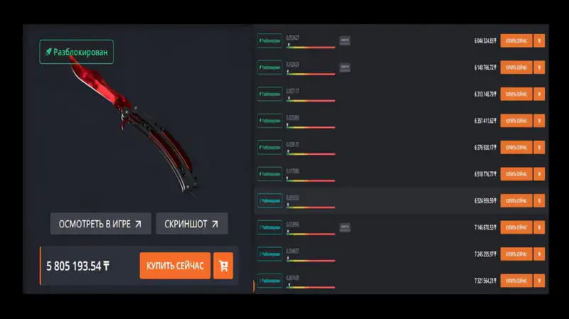 На различных платформах стоимость ножа колеблется от 5,8 до 11,4 миллиона тенге в зависимости от состояния предмета.