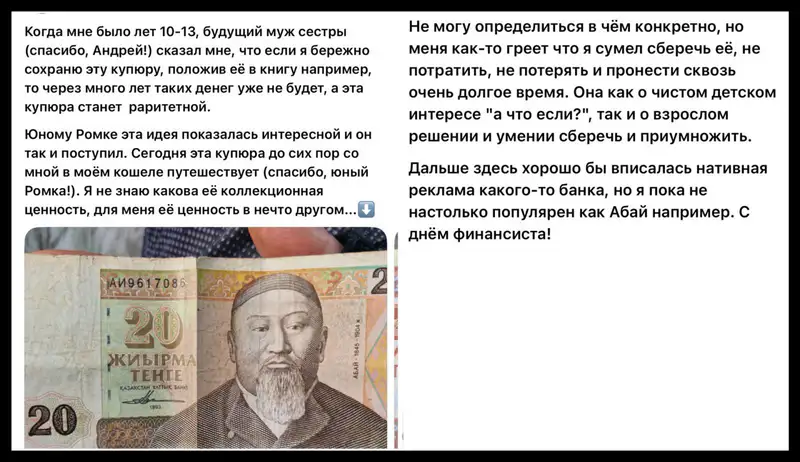 Недавнее внимание к редкой 20-тенговой купюре с портретом Абая Кунанбаева стало неожиданным событием в общественной жизни Казахстана. Эта банкнота, выпущенная в 1993 году, стала предметом обсуждения после публикации 37-летнего Романа из Темиртау, который хранил её в течение 25 лет как талисман.