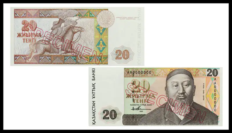 20-тенговая банкнота образца 1993 года выполнена в коричневой гамме. На лицевой стороне изображён портрет Абая Кунанбаева, а на обороте — охотник с беркутом. Эта банкнота была изъята из обращения в ноябре 2006 года, а её приём в банках завершился в конце 2012 года.
