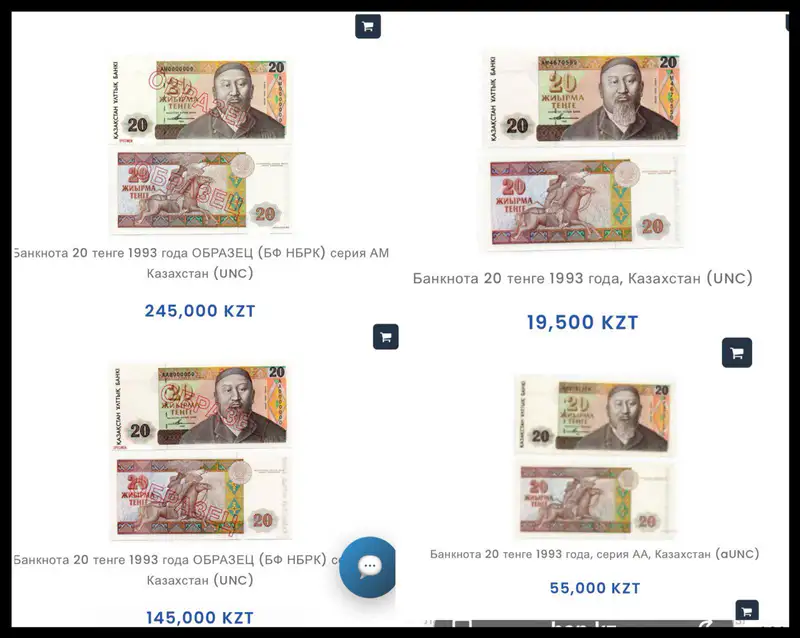 Согласно информации о текущих предложениях на рынке, стоимость 20-тенговой купюры сильно варьируется. Цены колеблются от 19 500 тенге до 246 000 тенге, что объясняется различием в сериях выпуска: