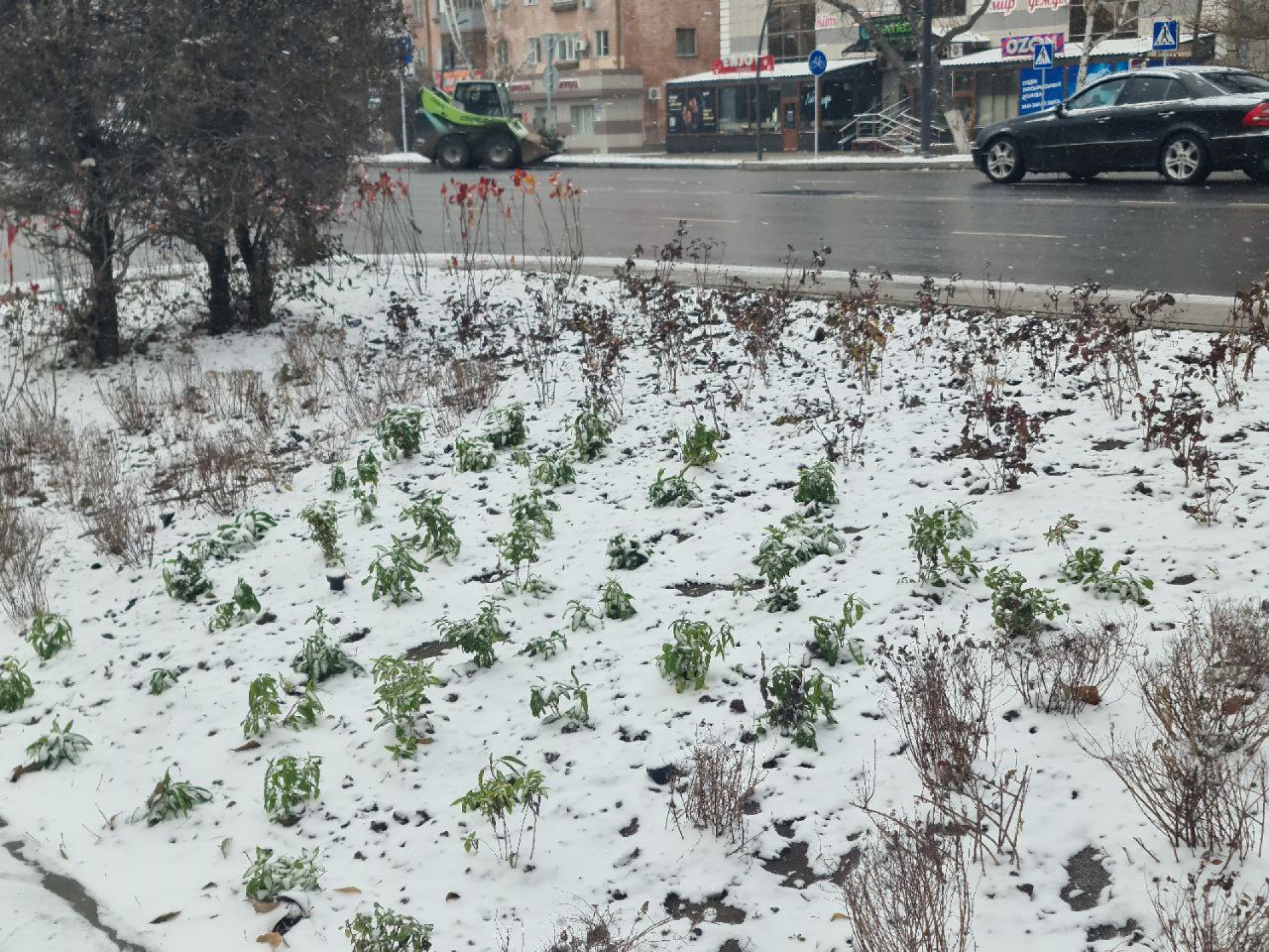 Вдоль дороги высадили кустарники, которые выглядят как палочки, так как высаживались при минусовой температуре. Местные студенты уверяют, что эти растения морозоустойчивы и выдерживают сильные холода.