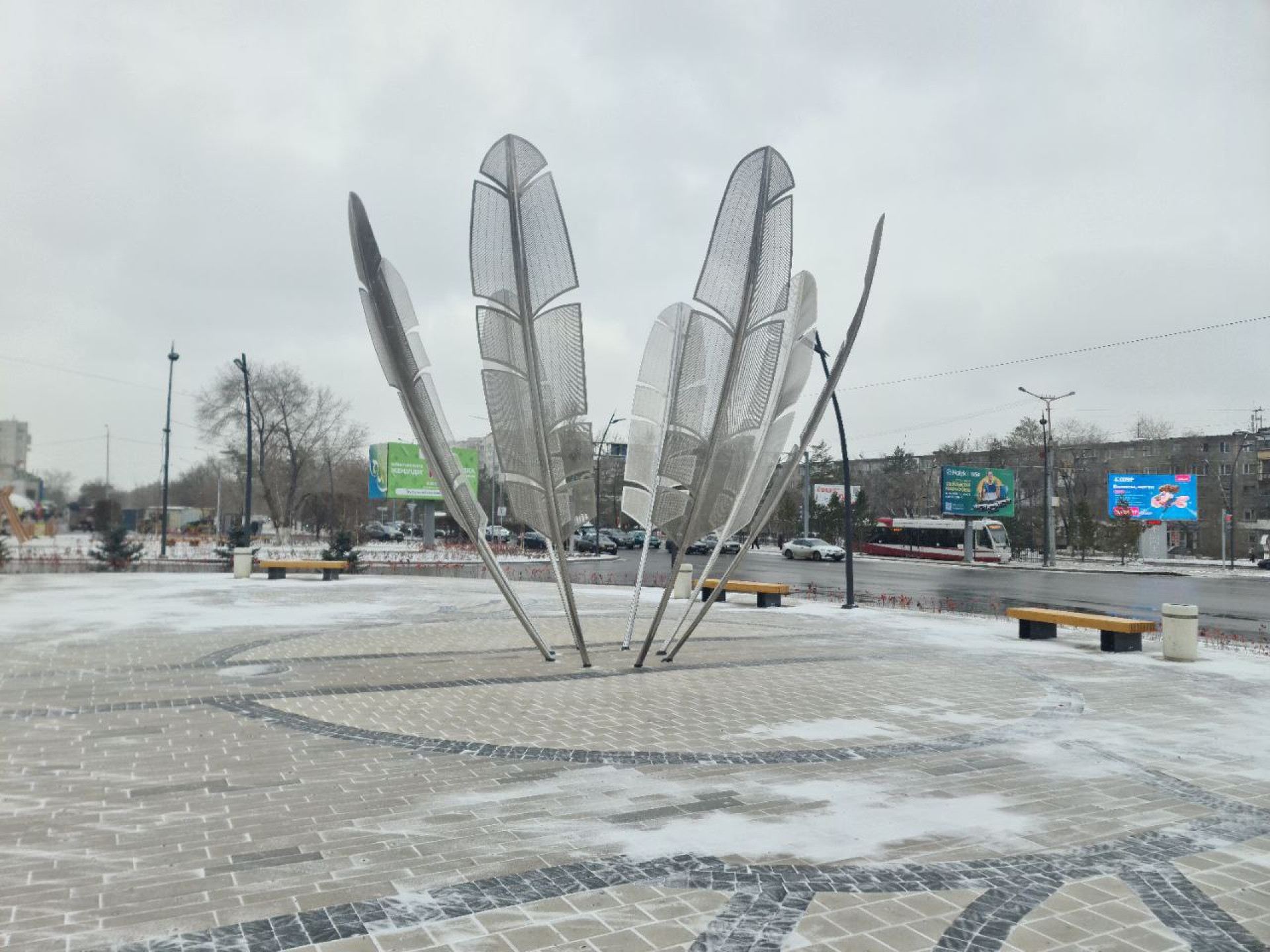 Первое, что бросается в глаза — это огромные перья, установленные на площади госсимволов. Они расположены в брусчатке напротив флагштока и уже приобрели грязно-серый цвет из-за пыли и выхлопов автомобилей.