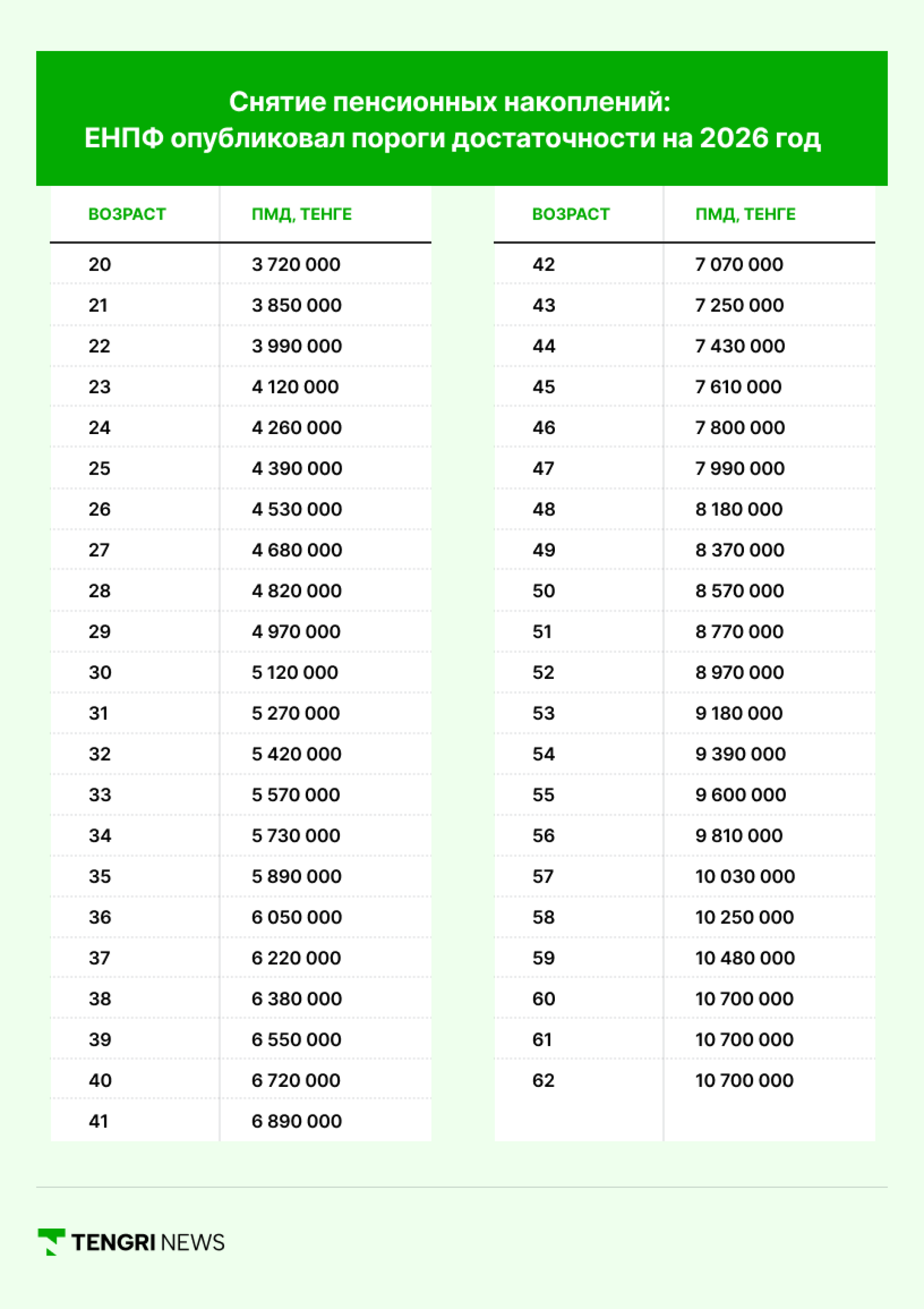С 2026 года в Казахстане вступят в силу обновленные пороги минимальной достаточности (ПМД) — суммы, которые должны оставаться на пенсионном счете, чтобы граждане могли использовать часть своих накоплений. Новые пороги, по данным Единого накопительного пенсионного фонда (ЕНПФ), увеличатся на 10 процентов. Для 20-летних порог составит 3,72 миллиона тенге, для 30-летних — 5,12 миллиона тенге, для 40-летних — 6,72 миллиона тенге, для 50-летних — 8,57 миллиона тенге, а для 60-летних — 10,7 миллиона тенге.