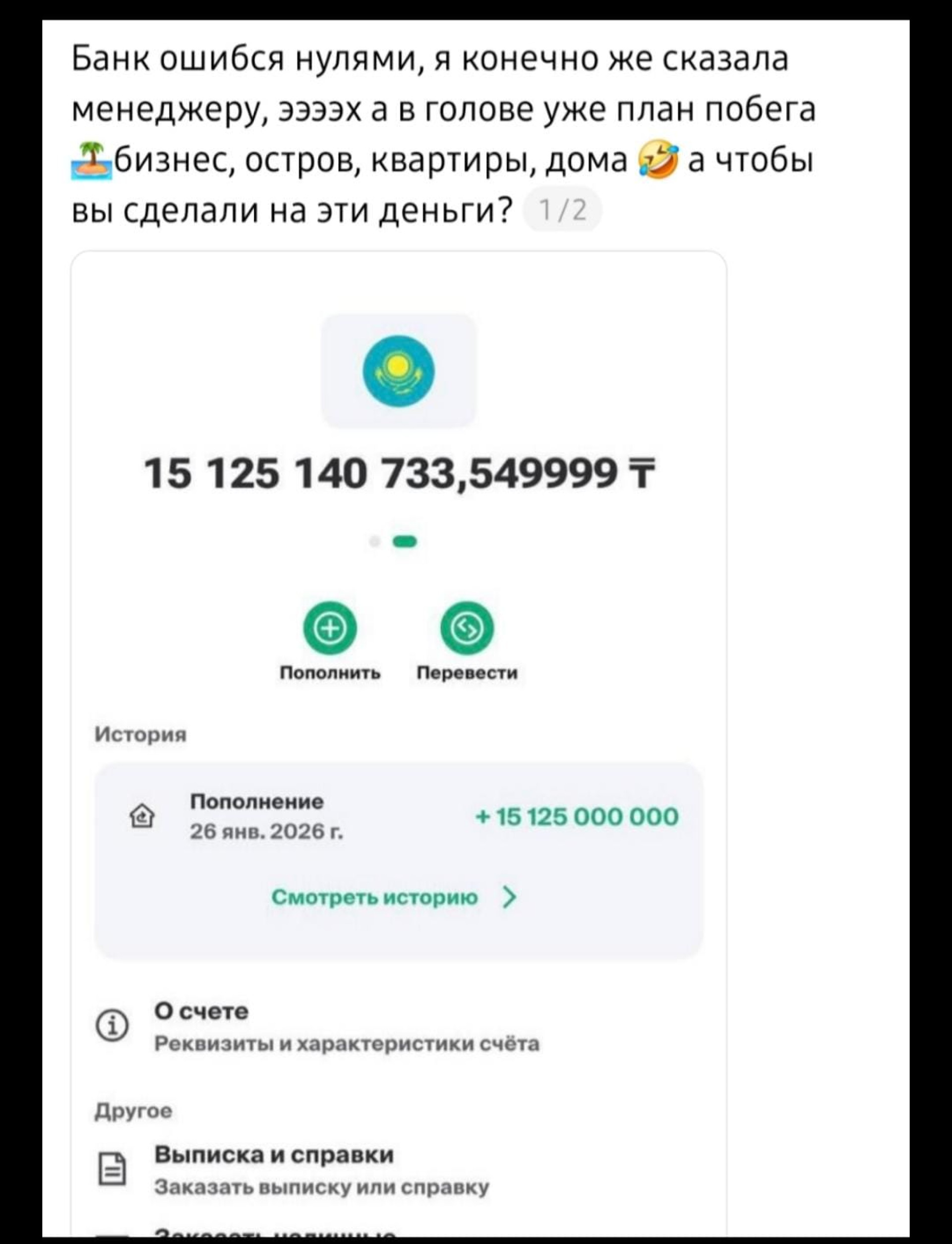 "Банк ошибся нулями. Я, конечно, сразу сообщила менеджеру. Эх, а в голове уже план побега: бизнес, остров, квартиры, дома. А что бы вы сделали на эти деньги? Я была пять минут тенговой миллиардершей," — написала она в своем посте.