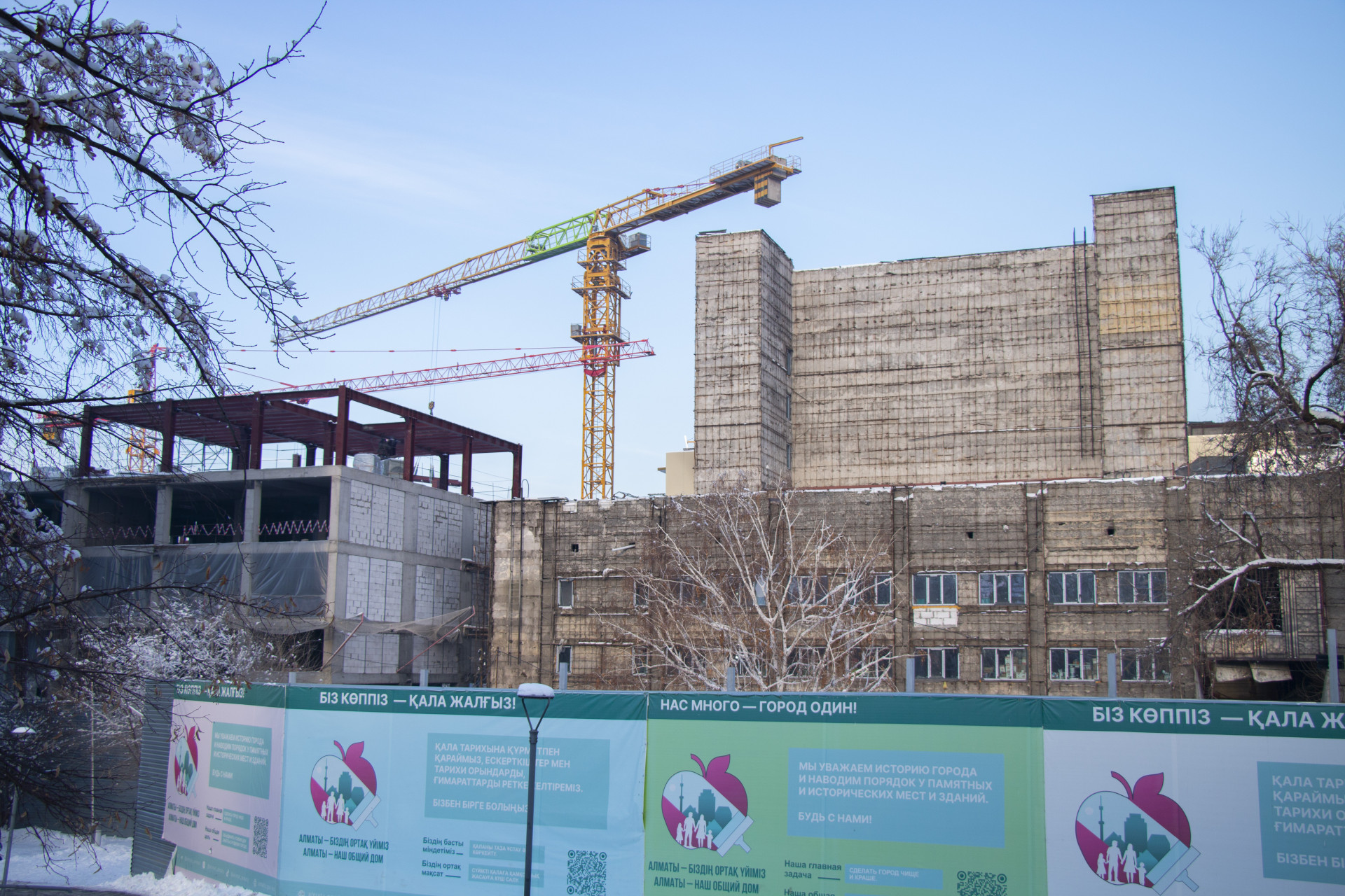 Работы активно продолжаются, и проект не заморожен, в отличие от реконструкции театра драмы имени Мухтара Ауэзова. Из-за заборов сложно разглядеть мозаичные панно на входной группе, но их состояние на текущий момент не изменилось.
