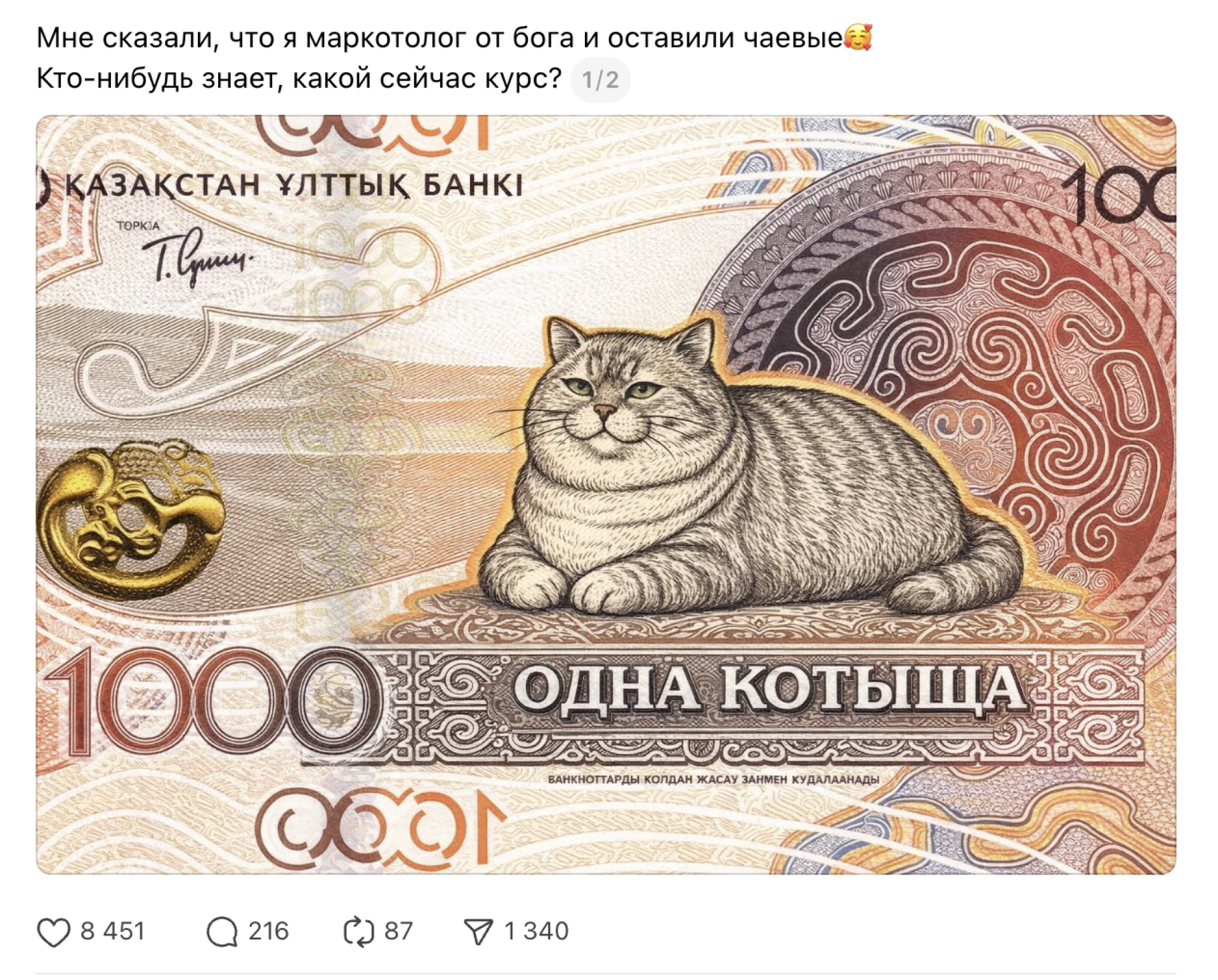 В Казахстане появилась интересная инициатива — предложили ввести в оборот оригинальную банкноту номиналом 1000 тенге с изображением кота, которую пользователи окрестили "котыща". Эта идея вызвала широкий резонанс и массу мемов в интернете.