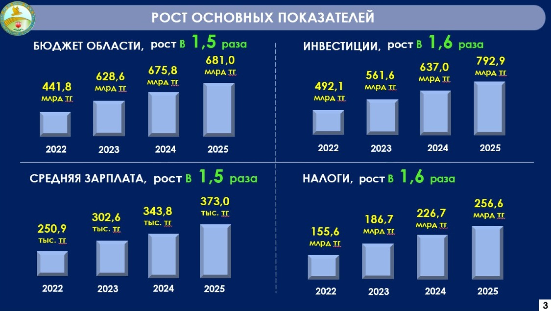 "За последние три года базовые экономические показатели значительно возросли. Областной бюджет и средняя заработная плата увеличились в 1,5 раза, а инвестиции в основной капитал — в 1,6 раза. За этот период объём прямых иностранных инвестиций составил 1,5 миллиарда долларов, а налоговые поступления выросли до 256,6 миллиарда тенге", — добавил Кумар Аксакалов.