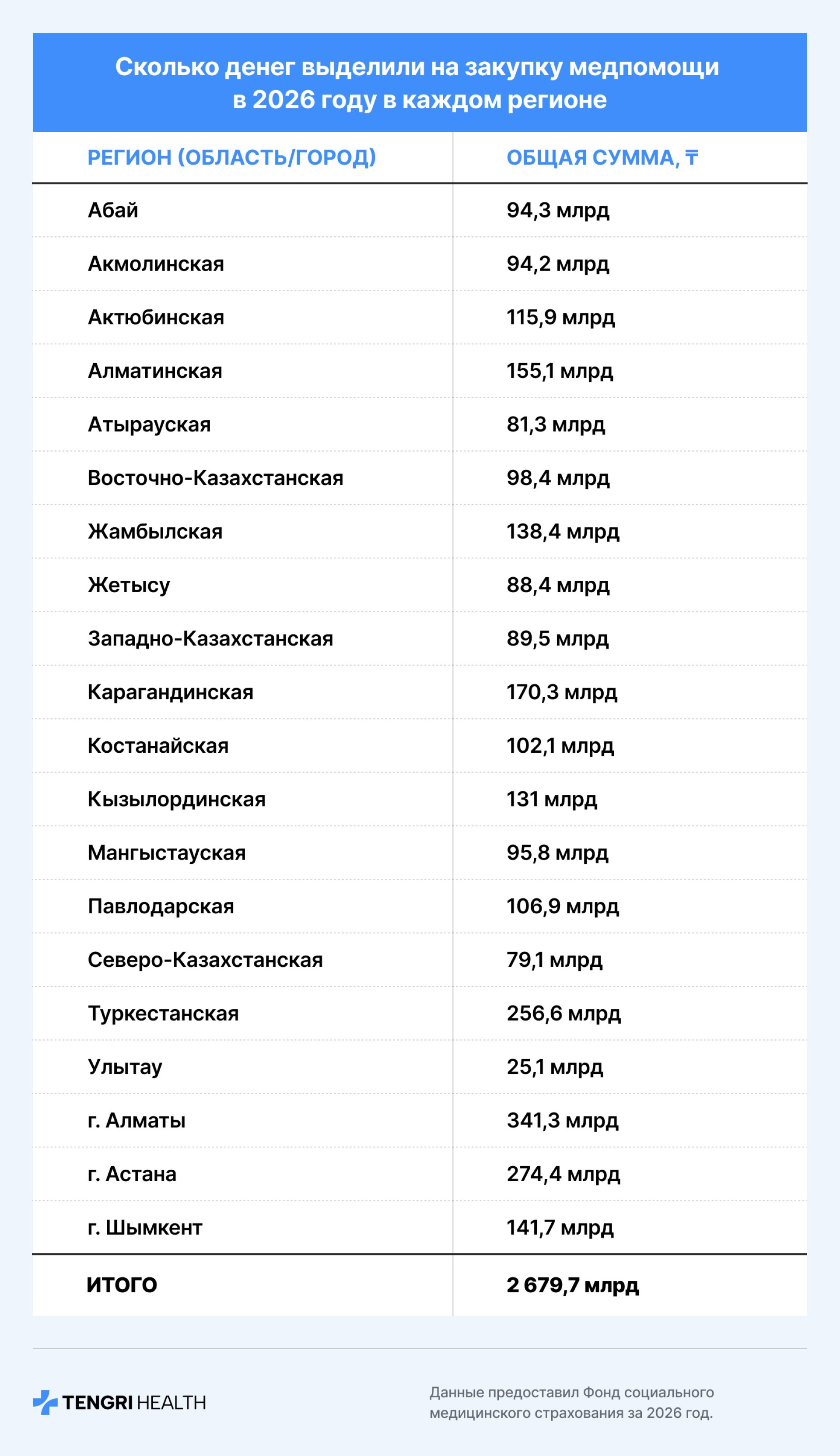 В 2026 году фонд социального медстрахования (ФСМС) Казахстана запланировал выделить на закуп медицинских услуг 2,7 триллиона тенге. Из этой суммы 1,36 триллиона тенге будет направлено через систему обязательного социального медицинского страхования (ОСМС), в то время как 1,3 триллиона тенге выделено в рамках гарантированного объёма бесплатной медицинской помощи (ГОБМП).