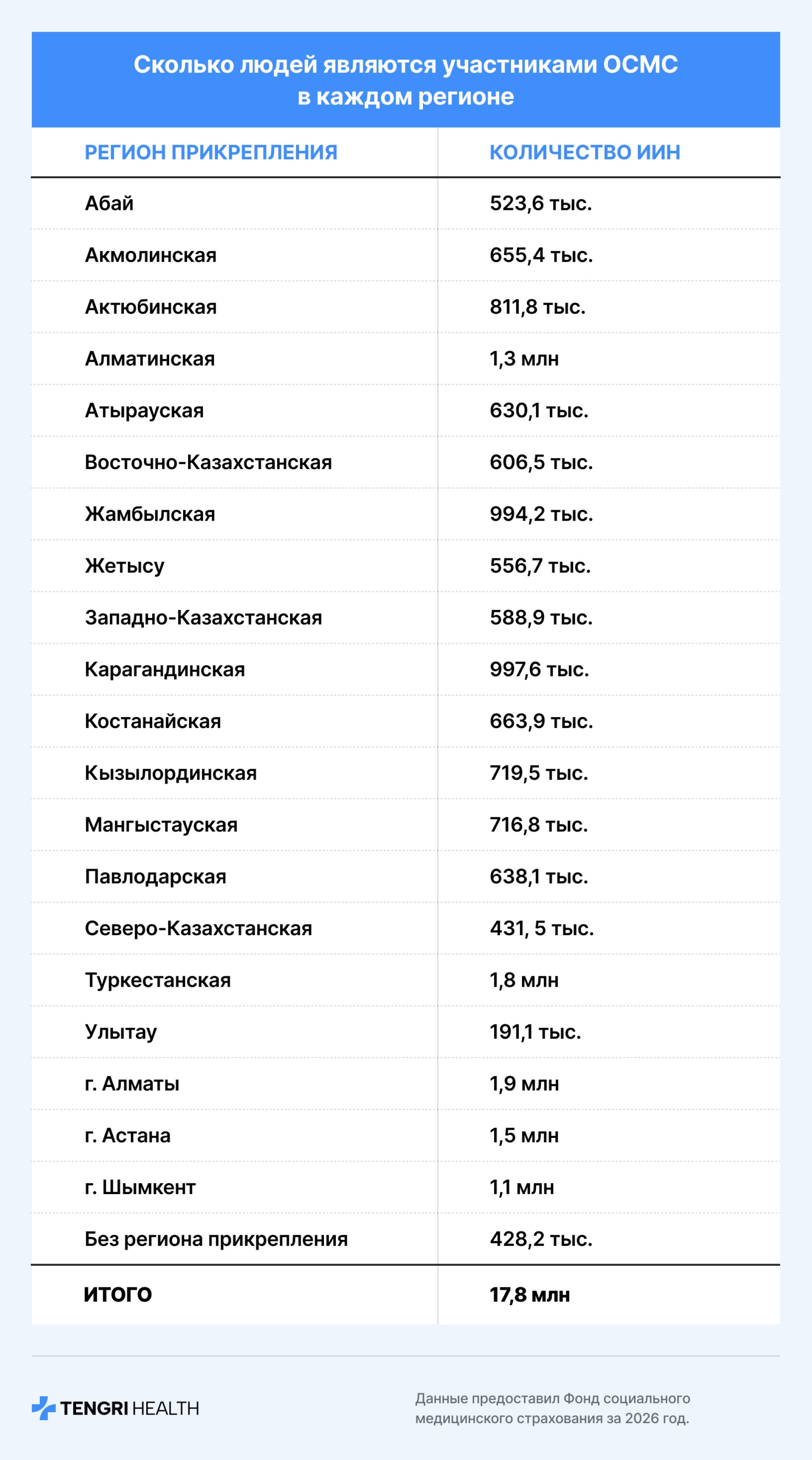 По состоянию на конец января 2026 года, в системе ОСМС зарегистрировано 17,8 миллиона граждан. Наибольшее количество застрахованных наблюдается в следующих регионах: