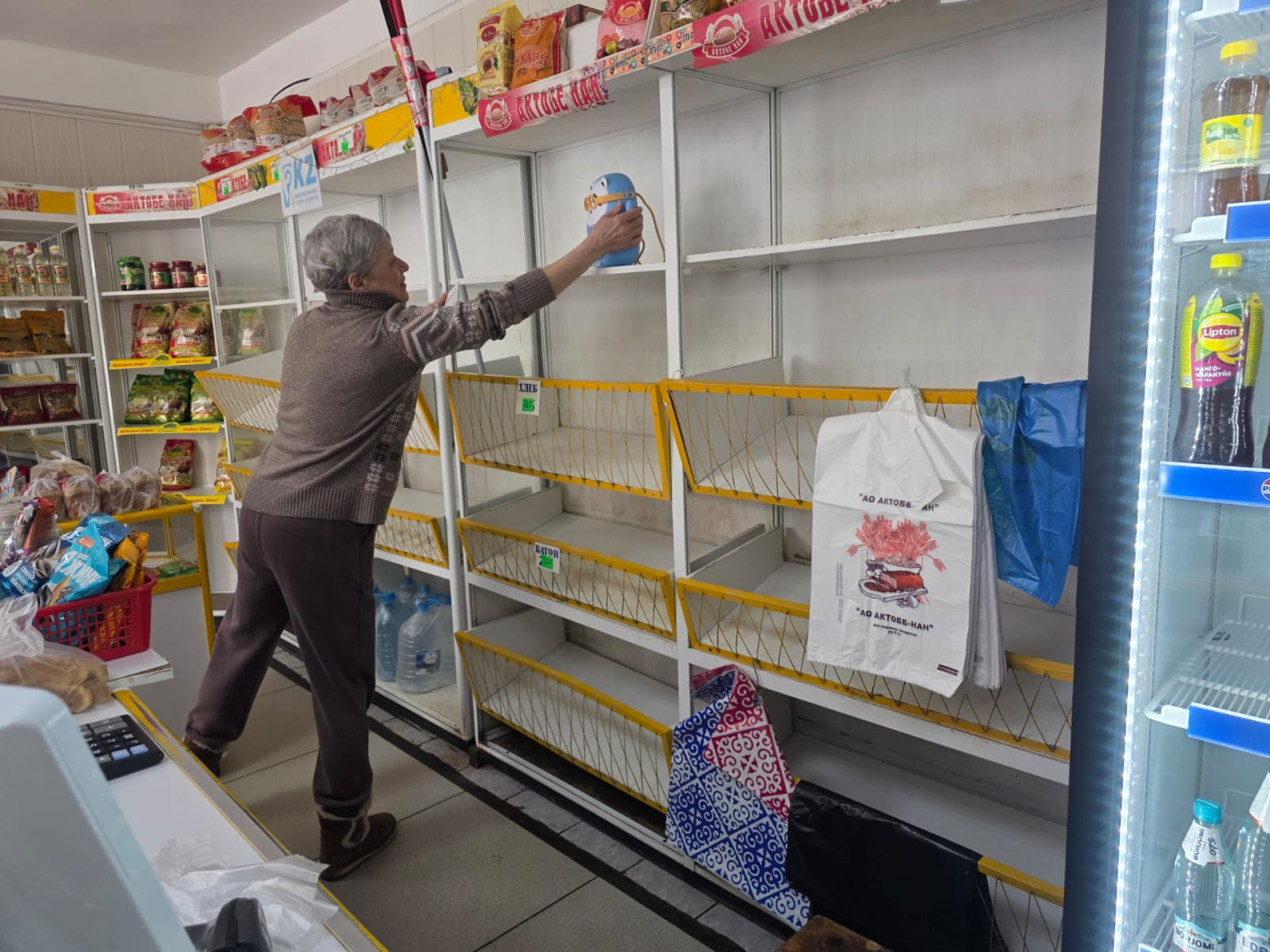 В фирменном магазине "Актобе нан" уже пустые прилавки, и постоянные покупатели, в основном пенсионеры, были предупреждены о том, что продукция не будет доступна в ближайшее время. "Каждый день приходят бабушки, спрашивают хлеб. Мы говорим, что завод закрыли. Нам тоже придется уходить, хотя мы 9 лет здесь стояли", — рассказала арендатор магазина Ольга Гурова.