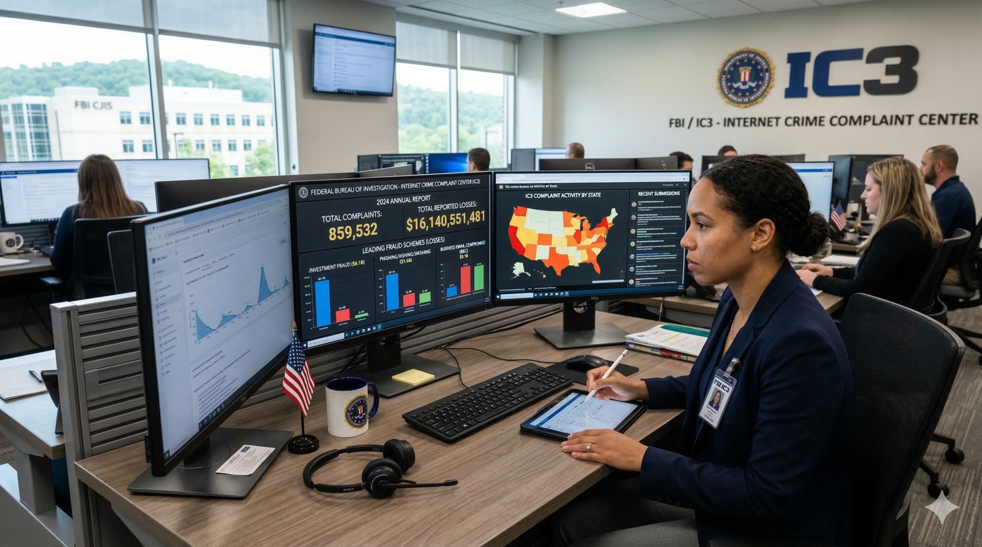 В США основным органом по борьбе с онлайн-преступлениями является Internet Crime Complaint Center (IC3), созданный ФБР. В 2024 году IC3 получил 859 532 жалобы на мошенничество, общая сумма ущерба превысила 16 миллиардов долларов. Самыми распространенными схемами стали инвестиционные мошенничества и фишинг. IC3 публикует отчеты, что позволяет государству отслеживать новые схемы и быстрее реагировать.